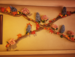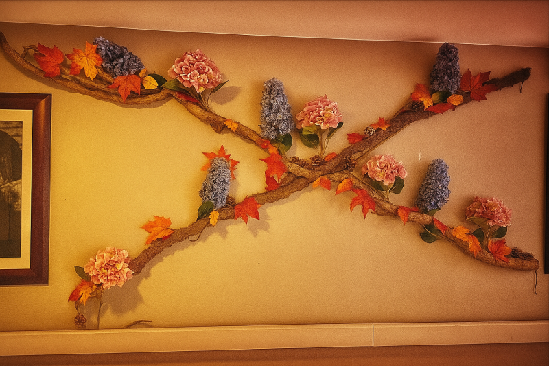 Entre les branches entrelacées, les hortensias délicats et les feuilles flamboyantes, cette décoration apporte une touche de chaleur et de poésie à nos repas.