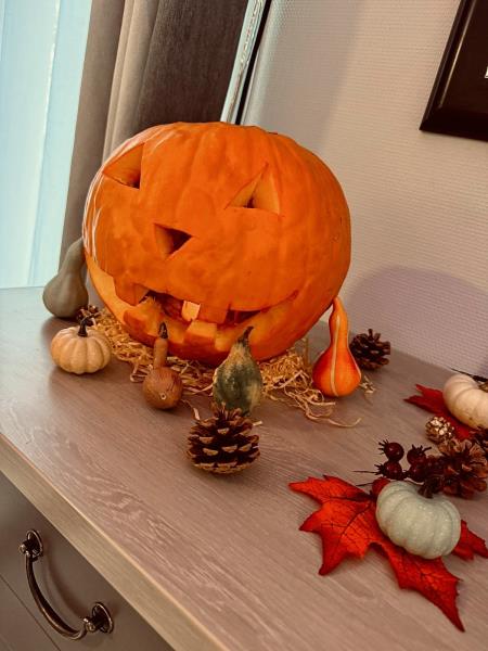Au détour du restaurant, une citrouille souriante accueille les résidents et visiteurs avec bonne humeur ! Sculptée avec soin et entourée de petites courges, de pommes de pin et de feuilles colorées, elle apporte une touche d’humour et de saison à notre décoration d’automne.